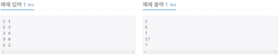 각 테스트 케이스마다 A+B를 출력한다.